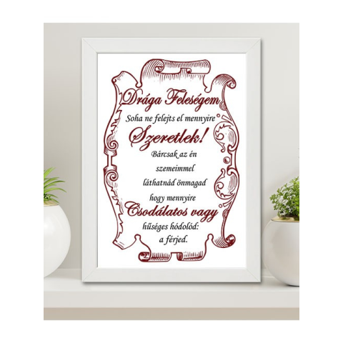 Évfordulós falikép nőknek, drága feleségem. Ha neked van a legcsodálatosabb feleséged, lepd meg őt házassági évfordulótokon, születésnapjára vagy karácsonykor és mondd el neki egy faliképpel mennyit is jelent ő neked. A képkeret színe, és a szöveg háttere