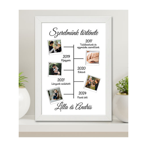 Évfordulós falikép, szerelmünk története. Személyre szabható szerelmünk története A4 falikép, amely tökéletes ajándék évfordulókra, Valentin napra, születésnapra vagy különleges alkalmakra. Közös történetetek legfontosabb pillanatait képekkel és dátumokka