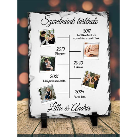 Évfordulós kőlap, szerelmünk története. Személyre szabható szerelmünk története kőlap, amely tökéletes ajándék évfordulókra, Valentin napra, születésnapra vagy különleges alkalmakra. Közös történetetek legfontosabb pillanatait képekkel és dátumokkal örökí