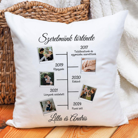 Évfordulós párna, szerelmünk története. Személyre szabható szerelmünk története párna, amely tökéletes ajándék évfordulókra, Valentin napra, születésnapra vagy különleges alkalmakra. Közös történetetek legfontosabb pillanatait képekkel és dátumokkal örökí