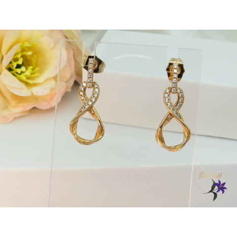 Antiallergén végtelen nyolcas fülbevalóFelső részén apró cirkóna kövek díszítik Szin: 18K Méret: 30x10mm Zár: bedugós szár 10mm
