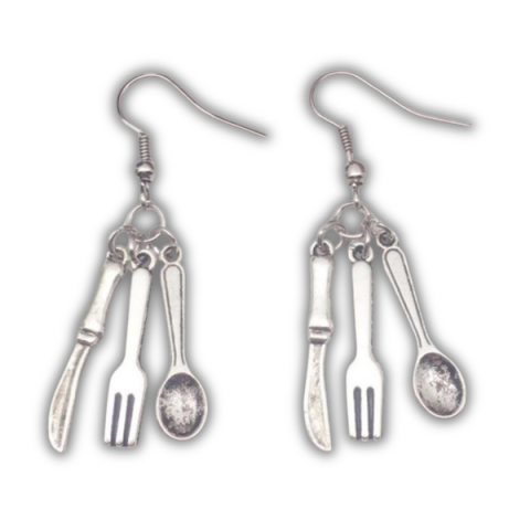 Humoros evőeszköz fülbevaló kés, villa és kanál medállal – tökéletes ajándék ötlet vicces ékszerek kedvelőinek. Egyedi dizájn és minőségi kidolgozás minden alkalomra