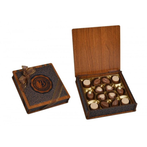 Vegyes töltelékkel töltött tej, ét és fehércsokoládé válogatás desszert exclusive fa díszdobozban