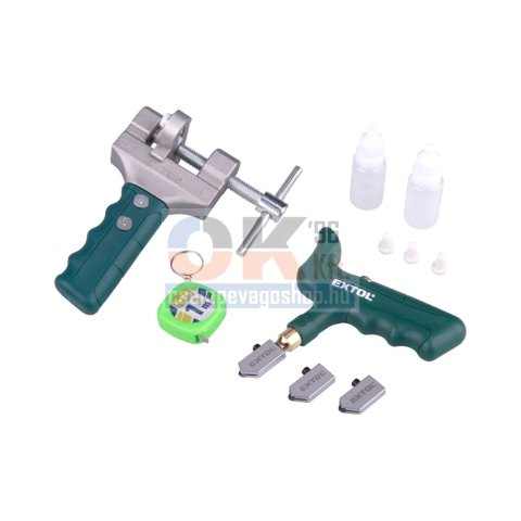 Extol üvegvágó és roppantó fogó (e941000) 1 db T alakú nyél, 3 db keményfém görgős vágófej, 1 db törő, 2 db olajtartály, 3 db műanyag távtartó elem, 1 db mérőszalag (1 méteres)