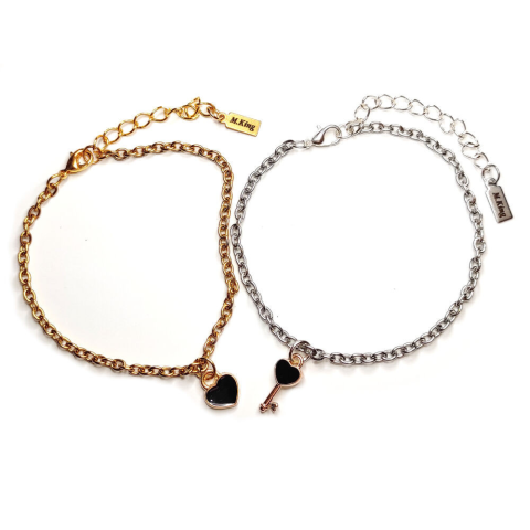 1 kép Ezüst-arany színű páros karkötő fekete szív és fekete kulcs charmmal