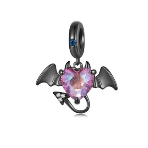 Fedezd fel az ékszerek varázslatos világát ezzel az egyedi, szárnyas ördög mintájú ezüst charmmal! A 925 sterling ezüstből készült darab eleganciát és misztikumot sugároz, amit a fehér cirkóniumkristályok és az áttetsző lila üveg díszítése tesz igazán kül
