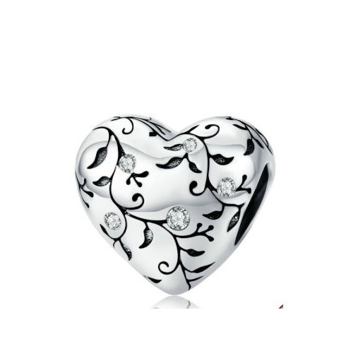 Fedezd fel az elegancia és a kifinomultság világát ezzel a gyönyörű ezüst charm-mal, amely szív alakú formájával és finom indamintával lenyűgöző választás minden alkalomra. A 925 sterling ezüstből készült darab csillogó cirkóniumkristállyal van díszítve,