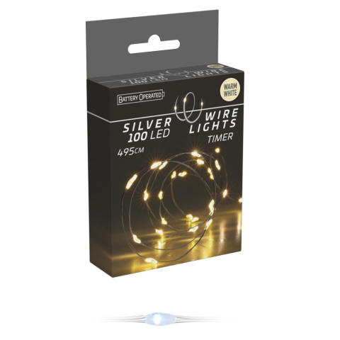 Ezüst drótkábeles fényfüzér 100 LED-es időzítős elemes (elem nélkül) meleg