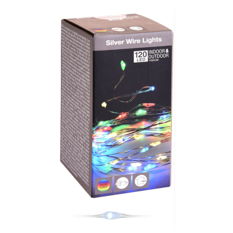 Ezüst drótkábeles fényfüzér 120 LED-es programos adapteres multi