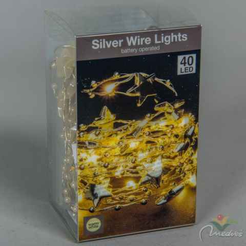 Ezüst drótkábeles gyöngyös csillagfüzér 40 LED-es elemes (elem nélkül) meleg