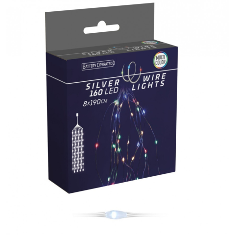 Ezüst drótkábeles korbács 160 LED-es elemes (elem nékül) multi