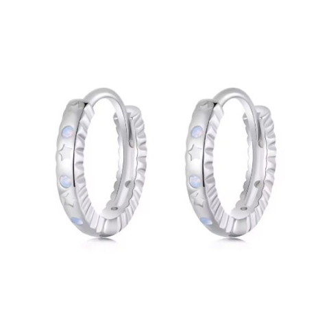 Ezüstből készült, fehérarany-bevonattal és opállal díszített fülbevaló. Mérete 1.3×0.2 cm, belső átmérője 1.0 cm, súlya 1.6 g.