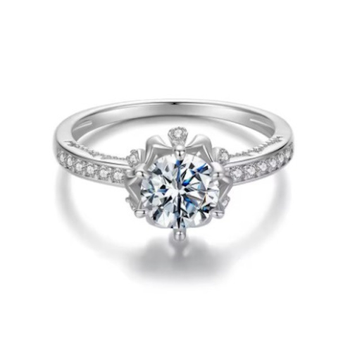Ez a lenyűgöző, 925 sterling ezüstből készült gyűrű tökéletes választás mindazok számára, akik szeretik a kifinomult eleganciát és a természet ihlette motívumokat. A finoman megmunkált, cirkónium- és moissanitkristályokkal díszített virág központi eleme e
