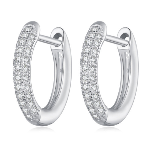Ezüstből készült női karikafülbevaló platinabevonattal és cirkóniumkristállyal. Mérete 1.4 × 0.2 cm, súlya 1.9 g.