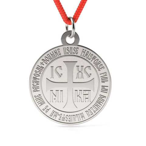 Ezüst Ortodox Ima Medál - Nika jelképpel Ez az elegáns ezüst medál tökéletes választás minden ortodox hívő számára. A medál kör alakú, és a Nika jelképet ábrázolja, mely a győzelmet és a hitet szimbolizálja. A medál köré ortodox imádság részlete van...