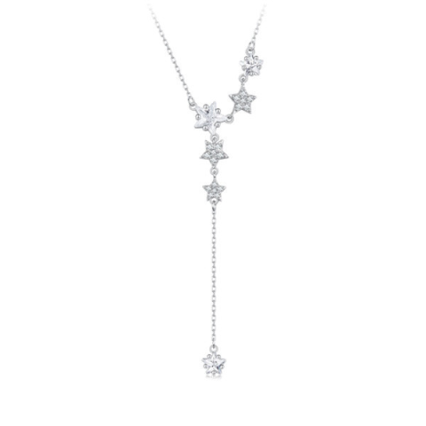 Ez a lenyűgöző, 925 sterling ezüstből készült női nyaklánc a csillagok varázslatos világát idézi meg. A platinabevonat elegáns csillogást kölcsönöz a láncnak, amelyet a finom cirkóniumkristályok tesznek igazán különlegessé. A nyaklánc 42 cm hosszú, ám a p