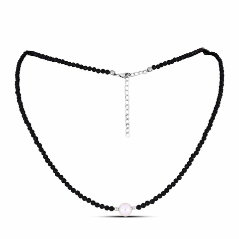1 kép Ezüst Nyaklánc Obszidiánnal és Fehér Édesvízi Kagylógyönggyel, Y62224