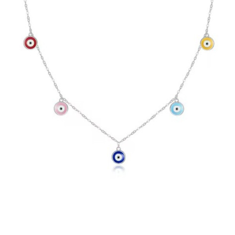 Engedd, hogy ez az elegáns ezüst nyaklánc, amelyet színes, őrző szemek díszítenek, a mindennapjaid részévé váljon. A 925 sterling ezüstből készült ékszer finom csillogása tökéletesen kiegészíti bármilyen öltözéked, legyen szó akár egy hétköznapi viseletrő
