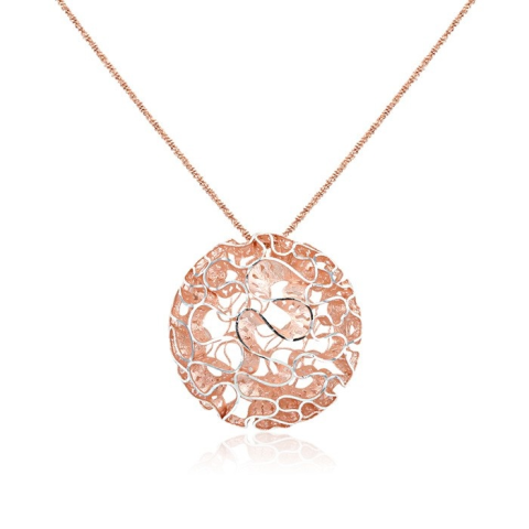 Egyszerű, női rosé ezüst nyaklánc, áttört kör alakú medállal. A lánc hosszúságú állítható méretben A medál 3,5 cm átmérőjű