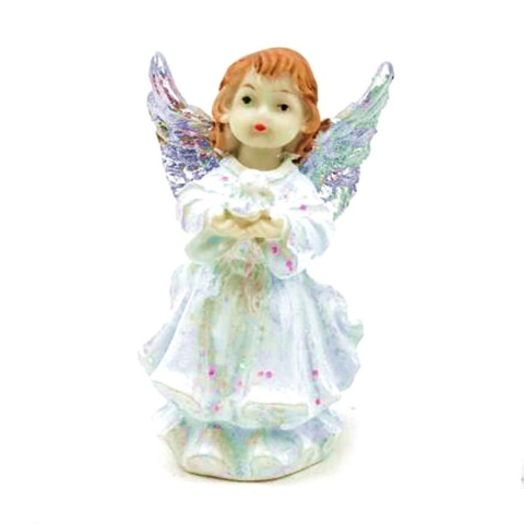 Bájos ezüstszárnyú angyalfigura, kezében galambot tart. Kedves kiegészítője koszorúknak, asztali kompozícióknak, de önálló figuraként is tökéletes dekorációja lehet otthonodnak.