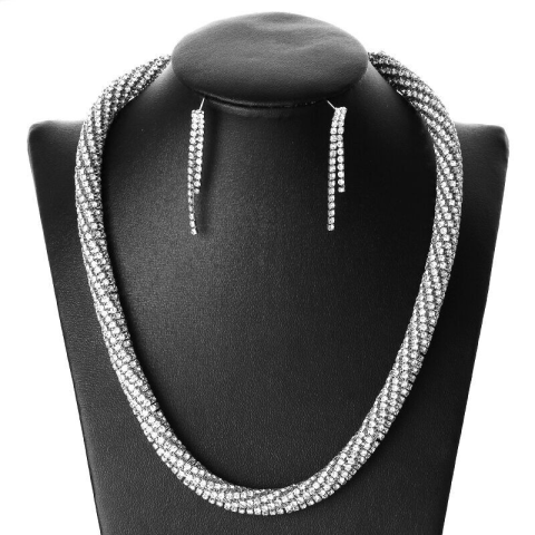 Ezüst színű csavart kristályos nyaklánc és fülbevaló szett