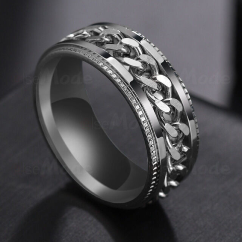 Ezüst színű nemesacél karikagyűrű, igényes kidolgozással. Nagyon vagány, középen a láncos rész elforog. Eljegyzésre, esküvőre is tökéletes, de a hétköznapokat is feldobhatod vele, megállja a helyét divatékszernek is. Szélessége: