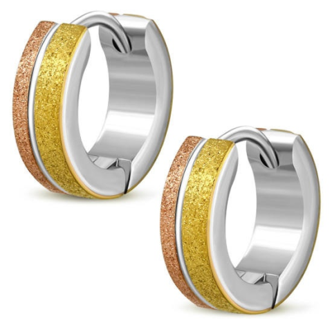 Tedd fel kérdésed a(z) Ezüst színű nemesacél karika fülbevaló, arany és rózsaarany színű homokfújt dísszel termékről!