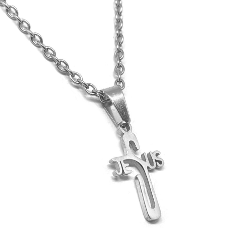 1 kép Ezüst színű Nemesacél Kereszt/Jézus felirat medál ezüst színű nyaklánccal