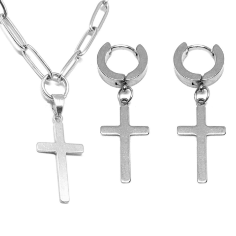 Ezüst színű Nemesacél Kereszt medálos hosszú szemes nyaklánc + fülbevaló szett