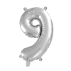 Ezüst színű, szám alakú fólia lufi „9” számmal, melyet használhatsz születésnapra, névnapra, vagy akár egy céges partykra is használhatod dekorációként. Tulajdonságok: Anyaga: fólia A lufi mérete: a második képen láthatóak A lufi levegővel és héliummal