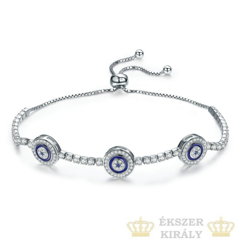 Ezüst teniszkarkötő kék berakással Kék berakással és strasszal díszített teniszkarkötő. A termék anyaga: 925 sterling ezüst, amit a magyar szabályoknak megfelelően: 2g feletti termék esetén a termékbe ütött vagy gravírozott névjel és/vagy fémjel tanúsít.M
