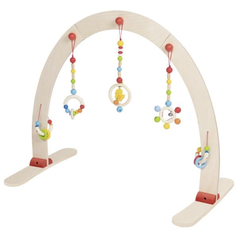 A fa babatornázó játszóállvány lelógó, színes játékai felkeltik a baba érdeklődését Eleinte csak nézegeti, majd ahogy fejlődik, már nyújtózik is feléjük. Ezáltal fejlődik a szem-kéz koordináció. A lelógó játékok levehetők az állványról. Mérete:73 x 41 x 58 cm.