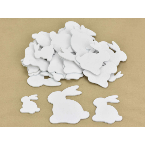 Fehér színű duci nyulak, vegyes méretekben húsvéti dekoráció megalkotásához.Ragaszthatod (pálcára) dekorációhoz, vagy masnival és szalaggal díszítheted stb.3 különböző méret: S:3,5x4cm, M:5x6cm, L:7x8cm