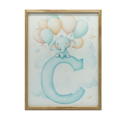 Cuki elefántos faliplakát gyerekszobába - 50x70 cm Ez a bájos faliplakát vidámságot és melegséget varázsol a gyerekszobába! Egy aranyos elefántbébi repül a levegőben lufikkal, a C betűn ülve. Tökéletes választás a kis C betűvel kezdődő nevet viselő g...