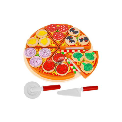 Szereted a pizzát? Most itt a lehetőség, hogy saját pizzádat készítsd el a legkreatívabb módon! Bemutatjuk a fából készült pizzakészletet, amely tökéletes választás minden kis séf számára. Ideális konyhai játékhoz, bulikhoz vagy akár egy saját kis étterem megnyitásához. Képzeld el, hogy mostantól teljesen egyedül készítheted el a pizzádat! A pizzadarabok és a feltétek tépőzárral kapcsolódnak egymáshoz, így könnyedén ""felvághatod"" őket, és a zöld