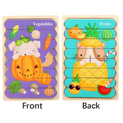 Fa puzzle csíkok - kétoldalas - Zöldségek és gyümölcsök A puzzle játék fejleszti a gyermekek szem-kéz koordinációját, téri érzékelésüket, szín - és formaészlelésüket, a rész-egész viszony felfedezését, és kiválóan alkalmas a környező világról való ismeretek bővítésére. A puzzle csíkok két oldalán más-más kép található. A játékhoz képi segítség is tartozik, a kép kivehető és eltávolítható, így a nagyobb gyerkőcöknek nehezítésként