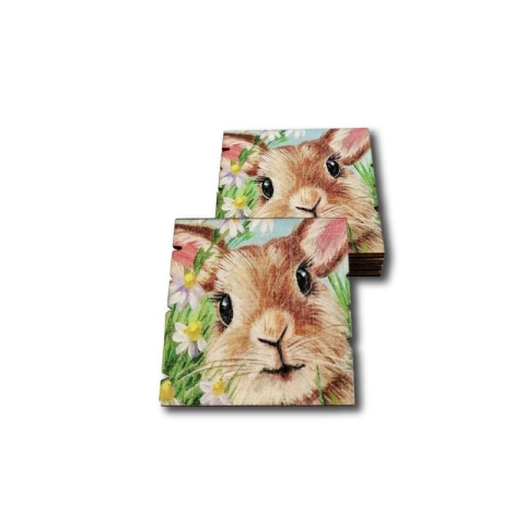 Nyuszipofi Méret: 5,2x5,2cm Lézervágott, színezett fa lap Táblácska - Nyuszipofi Méret: kb 5,2x5,2cm Díszítésekhez használható táblácska. A figura jól mutat virágboxokban, függő díszeken.