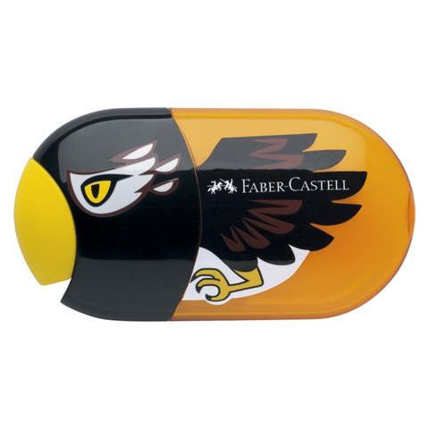 Hegyező és radír, kétlyukú, tartályos, FABER-CASTELL, sas minta alkalmas normál és jumbo méretű grafit és színes ceruzák hegyezésére biztonsági csavarral beépített radír Gyártó/első EU forgalmazó elérhetősége: A.W. Faber-Castell Vertrieb GmbH Germany