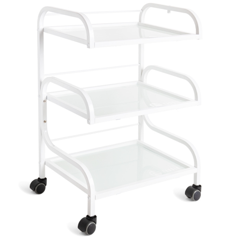 A praktikus Fabulo Orion kozmetikai eszköztartó kocsi három, elölről nyitott üvegpolccal rendelkezik, ami lehetővé teszi kozmetikai eszközök és berendezések tárolását. Négy kerekének köszönhetően az asztalka teljesen mobilis, könnyen mozgatható. A fehér fém szerkezet rendkívül stabil, és kozmetikai lámpa rögzítésére is alkalmas.