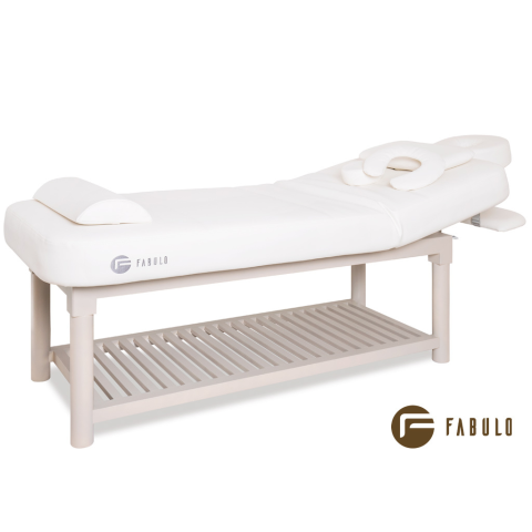 A professzionális Fabulo Spa Harmony 300 wellness ágy masszív, szürke fa szerkezettel rendelkezik. Az alul található tágas polcnak köszönhetően eszközei mindig kéznél és a megfelelő helyen lesznek.