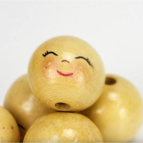 2 cm átmérőjű fagolyók, festett arccal. Alkalmas felfűzéshez, bábuk készítéséhez, vagy egyszerű díszítésekhez.