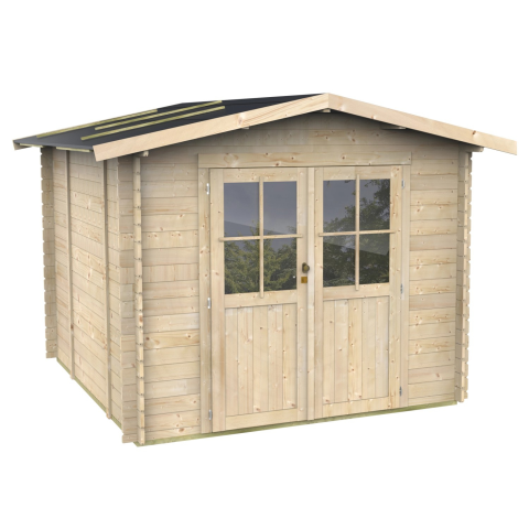 Olaszországban gyártott Madame kerti ház, 25 mm vastag természetes fenyőfából, sarkain megerősített, kétszárnyú ajtó finger joint vázzal, tető 16 mm nyers fenyőből, szürke palaburkolat, vastagság 3 mm, autoklávban impregnált gerendák és alapprofilok, a padló 16 mm vastag nyers fenyő. A készlet tartalmazza a szereléstechnikai anyagokat és az összeszerelési útmutatót. A fa PEFC tanúsítvánnyal rendelkezik, amely garantálja, hogy olyan erdőkből származik, amely