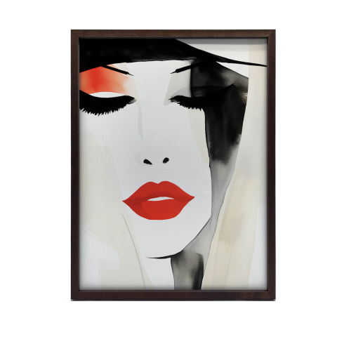 Női arckép poszter sötét fa keretben - 70x100 cm Elegáns és modern falikép, amely feldobja otthonát! Ez a 70x100 cm-es, sötét fa keretes poszter egy stílusos női arcot ábrázol, élénk vörös ajkakkal és fekete-fehér részletekkel. A matt, 230 g/m2-es pa...
