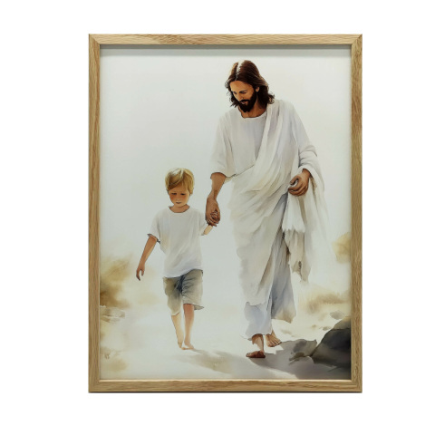 Jézus és a gyermek: Lelki békét sugárzó falikép (70x100 cm) Ez a gyönyörű falikép Jézust és egy gyermeket ábrázolja, akik kézen fogva sétálnak. A kép békét, szeretetet és reményt sugároz, és tökéletes választás otthonába, ha szeretné megteremteni a ny...