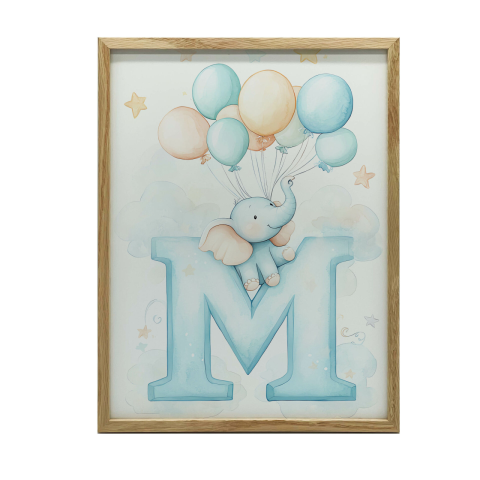 Bálonos elefántos falikép - Gyerek szoba dekoráció 70x100 cm Ez a bájos falikép tökéletes választás gyermeked szobájának díszítésére! Egy aranyos elefántka, színes léggömbökkel a levegőben, egy nagy "M" betűn ülve. Vidám, színes, és egyedi...