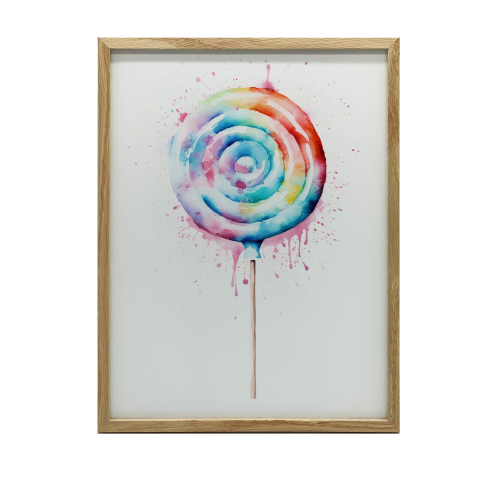 Szivárványos nyalóka falikép: Vidám dekoráció gyerekszobába 🍭 Ez a gyönyörű szivárványos nyalóka falikép vidámságot és színt visz a gyerekszobába! Marcin Zbijowski lengyel művész alkotása, 230 gsm-es matt papírra nyomtatva, elegáns sötétbarna fa ker...