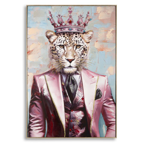 Királyi leopárd - elegáns falikép arany kerettel 👑🐆 Ez a lenyűgöző falikép egy elegáns leopárdot ábrázol királyi koronában, rózsaszín öltönyben. A képet arany fém és fa keret díszíti, és domborműves részletekkel gazdagítva. Tökéletes választás, ha...