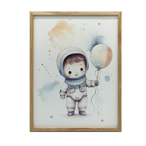 Űrhajós léggömbbel – Gyerek szoba dekoráció 70x100 cm Ez a gyönyörű, kézzel készített poszter tökéletes választás gyermeked szobájának dekorálásához. Egy aranyos űrhajós látható rajta, aki egy színes léggömböt tart a kezében. A kép vidám és álmodozó...