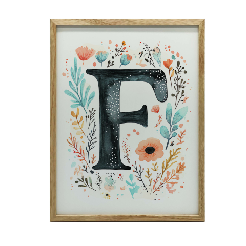 Virágos F betűs falikép fa keretben - 50x70 cm Ez a gyönyörű falikép tökéletes választás, ha egyedi és stílusos dekorációt keres otthonába. A kézzel készített, 230 gsm-es matt papírra nyomtatott kép egy nagy F betűt ábrázol, melyet színes virágok ves...