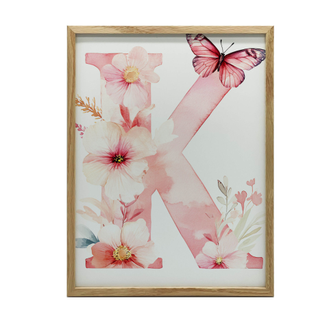 K betűs virágos falikép gyerekszobába - 50x70 cm 🌸 Varázslatos virágdekoráció a kicsik szobájába! Ez a gyönyörű falikép vidám, pasztellszínű virágokkal és egy aranyos pillangóval díszített K betűvel garantáltan feldobja a gyerekszobát. A sötétbarna...